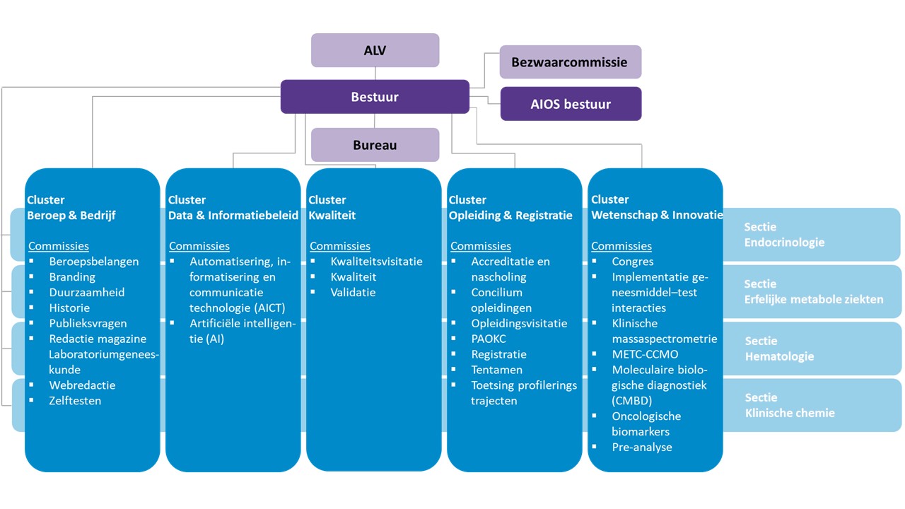 De clusters van de NVKC sluiten aan bij de structuur van de Federatie Medisch Specialisten (FMS). Externe vertegenwoordigers vanuit de diverse NVKC clusters participeren in de corresponderende Raden van de FMS. Er zijn diverse werkgroepen actief binnen de clusters. Naast clusters kent de NVKC secties. Het doel van een sectie is het bewaken en ontwikkelen van het betreffende deelgebied binnen het totale vakgebied. De sectie Hematologie wordt ingevuld door de VHL (Home | De VHL).